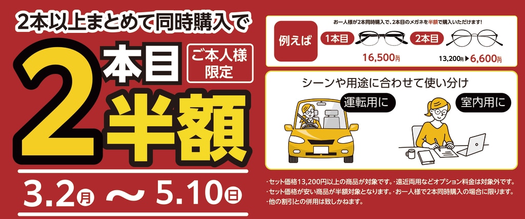 ・セット価格13,200円以上の商品が対象です。・遠近両用などオプション料金は対象外です。 ・セット価格が安い商品が半額対象となります。・お一人様で2本同時購入の場合に限ります。 ・他の割引との併用は致しかねます。